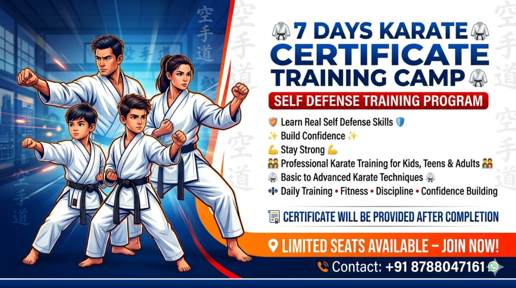 We are organizing a 7 days Self Defense Karate Camp for beginners and all age groups (Age 8+). This camp is designed to help you learn how to protect yourself in real-life situations and build confidence.