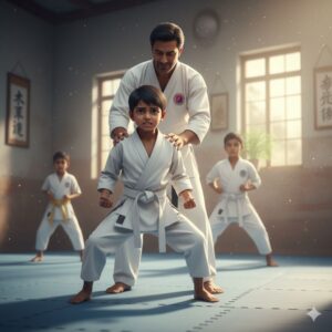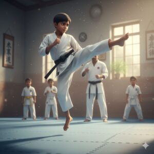 In a small village lived a quiet and shy boy named Aarav. Children at school often teased him, and he lacked the confidence to stand up for himself. Seeing this, his father wished for him to become stronger—not just physically, but mentally as well. So he enrolled Aarav in a karate class.