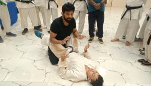 He is striking a pose characteristic of Muay Thai, also known as “The Art of Eight Limbs,” a traditional Thai martial art that utilizes fists, elbows, knees, and shins.
